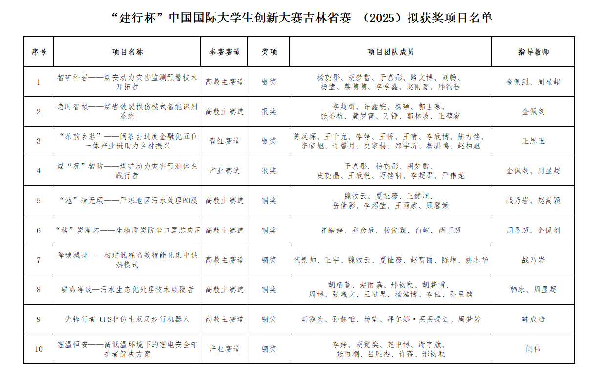 近日,由吉林省教育厅、吉林省科学技术厅等9个部门主办的“建行杯”中国国际大学生创新大赛(2025)吉林省赛圆满落幕并公布了成绩。应急科学与工程学院在本届大赛中勇创佳绩,斩获省级银奖4项、铜奖6项。